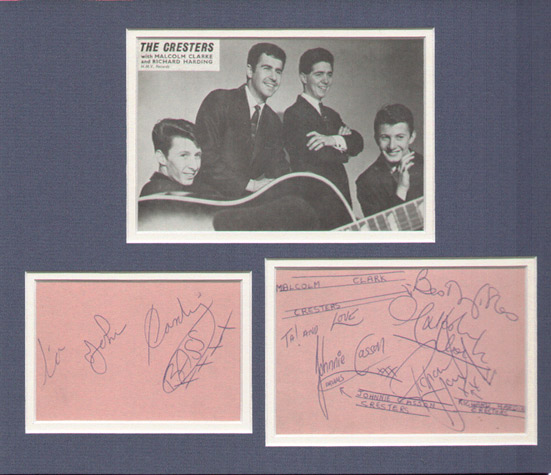 Malcolm Clarke and the Crestas Malcolm Clarke - vocals (Not to be confused with Johnny Peters and the Crestas (from Manchester)! Originally 'The Cresters' were formed in Bramley near Leeds in Yorkshire to back-up singer Mike Sagar. They were known as 'Mike Sagar and the Cresters', 'Malcolm Clarke and the Cresters' 'The Cresters' and lastly with a subtle spelling change, as 'The Crestas'. Doubtless they will never forget supporting The Beatles in 1963 but most will remember them for Richard Harding's technical ability on guitar which was and continues to be much admired, as was his Gretsch White Falcon guitar, so far out of the financial reach of most at £700 (18 months wages for most at the time!) albeit acquiring the guitar may have had something to do with his father owning a music shop! Their last single (for Fontana Records) 'To Be Loved' / 'When I Fall In Love' as 'The Crestas' was released in 1965 before they evolved into cabaret work in the eighties with Malcolm Clarke on vocals until he died and John took over on vocals. They eventually called it a day in 1984. John Harding had a 3-year solo career following their demise and drummer, Johnnie Casson is now a successful club comedian with TV appearances under his belt, while Richard Harding is currently a member of country band, Dillinger.